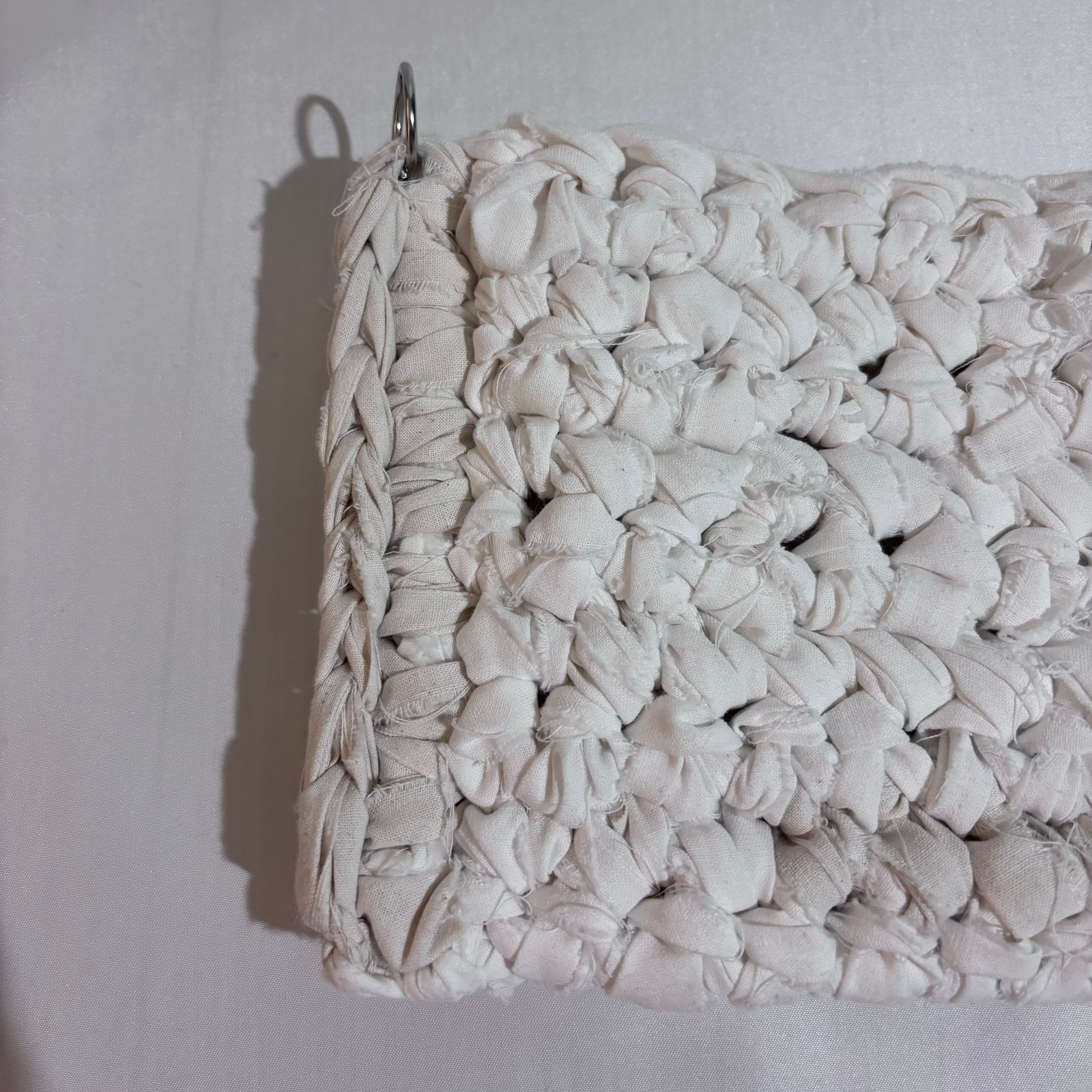 ・ロープのように編み込まれたサイドのデザイン、表面に4本のラインが施されているマチなしサコッシュタイプのバッグ。