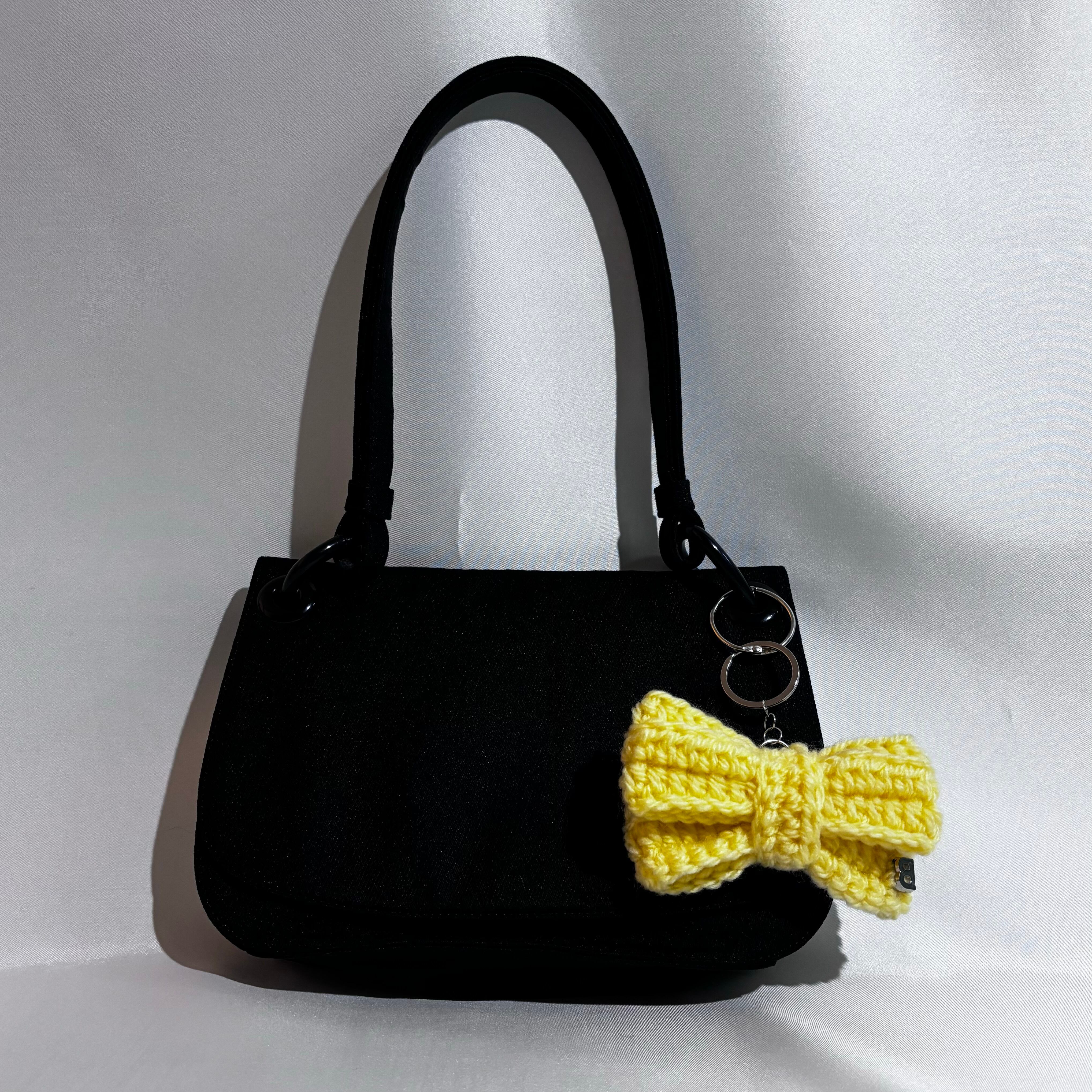 大きめのざっくりした網目で編み込まれたニットリボンチャーム.