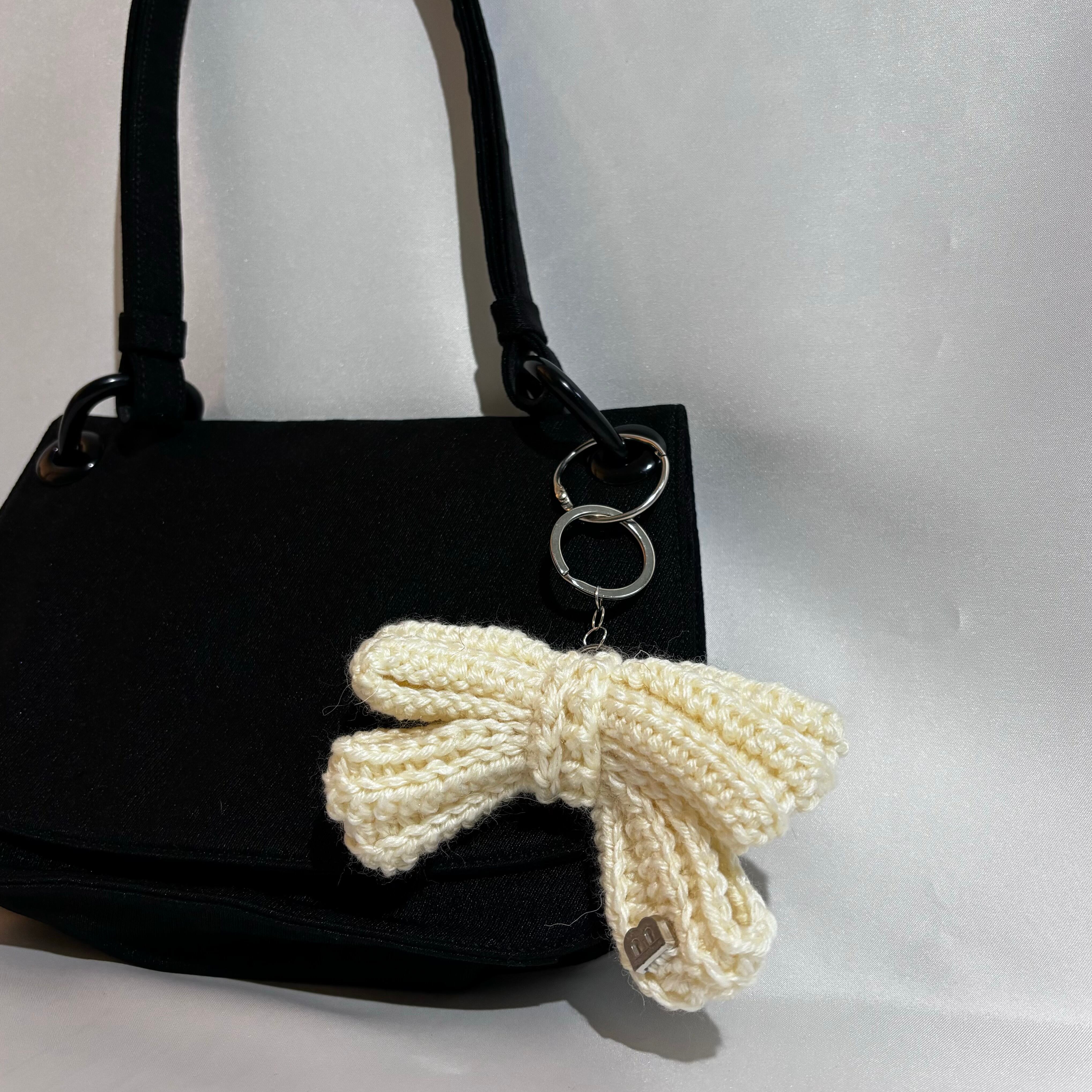 大きめのざっくりした網目で編み込まれたニットリボンチャーム.